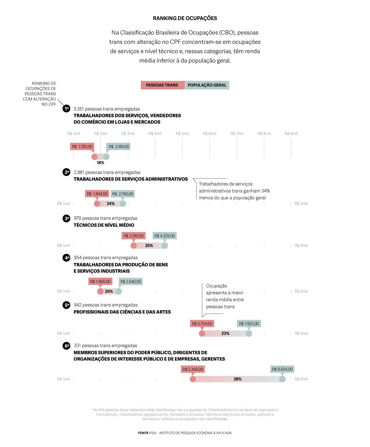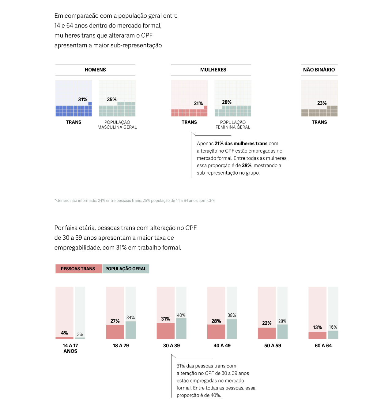 É importante destacar que a pesquisa não compreende o total de pessoas trans no Brasil. Foram levadas em conta apenas aquelas que oficializaram sua mudança de gênero por meio da alteração formal de nome e/ou sexo/gênero. Contudo, os números indicam iniquidades a que jornalistas, ativistas e responsáveis pela formulação de políticas públicas devem se atentar para que o acesso e a permanência de pessoas trans no mercado de trabalho formal evoluam nos próximos anos.