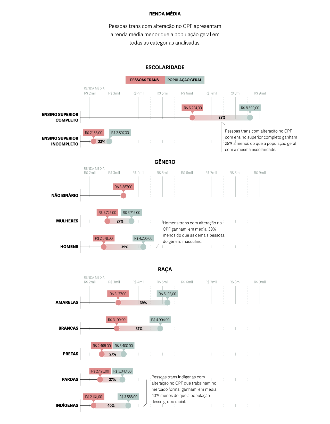 Os dados também evidenciam desigualdades atravessadas por gênero e raça, indicando que a exclusão no mercado de trabalho não ocorre de forma homogênea dentro da própria comunidade trans.
